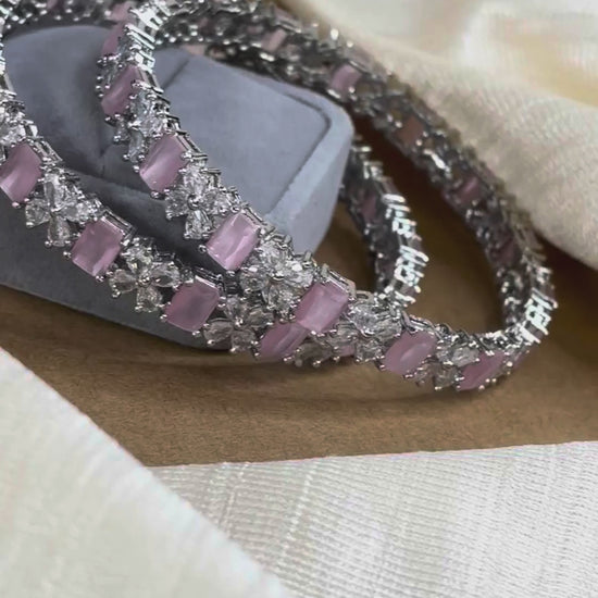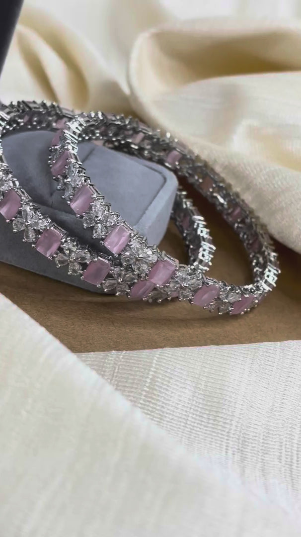 Adorn your wrists with a touch of delicate glamour with this exquisite pair of bangles. Crafted from a high-quality alloy and finished with a brilliant rhodium plating, these bangles are designed to catch the light from every angle. The intricate design features a mosaic of sparkling AD stones, beautifully complemented by striking rose quartz artificial stones that add a pop of gentle color. The meticulous detailing and secure clasp ensure both style and comfort.