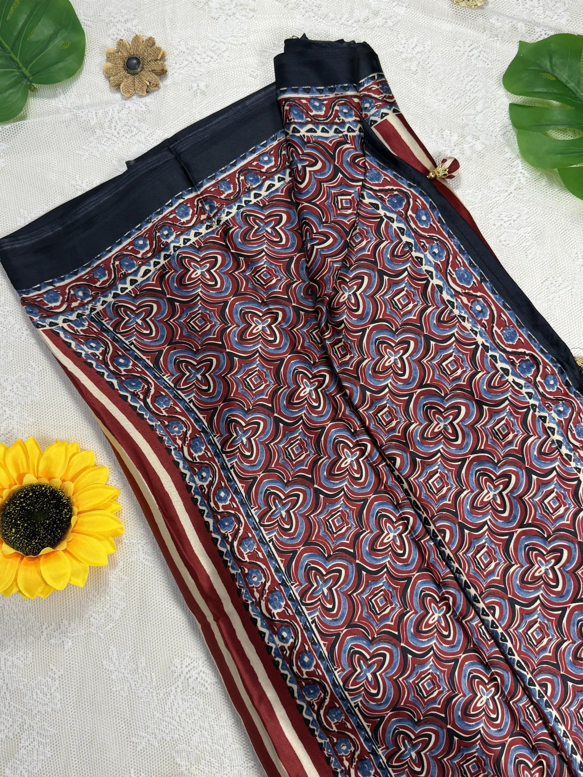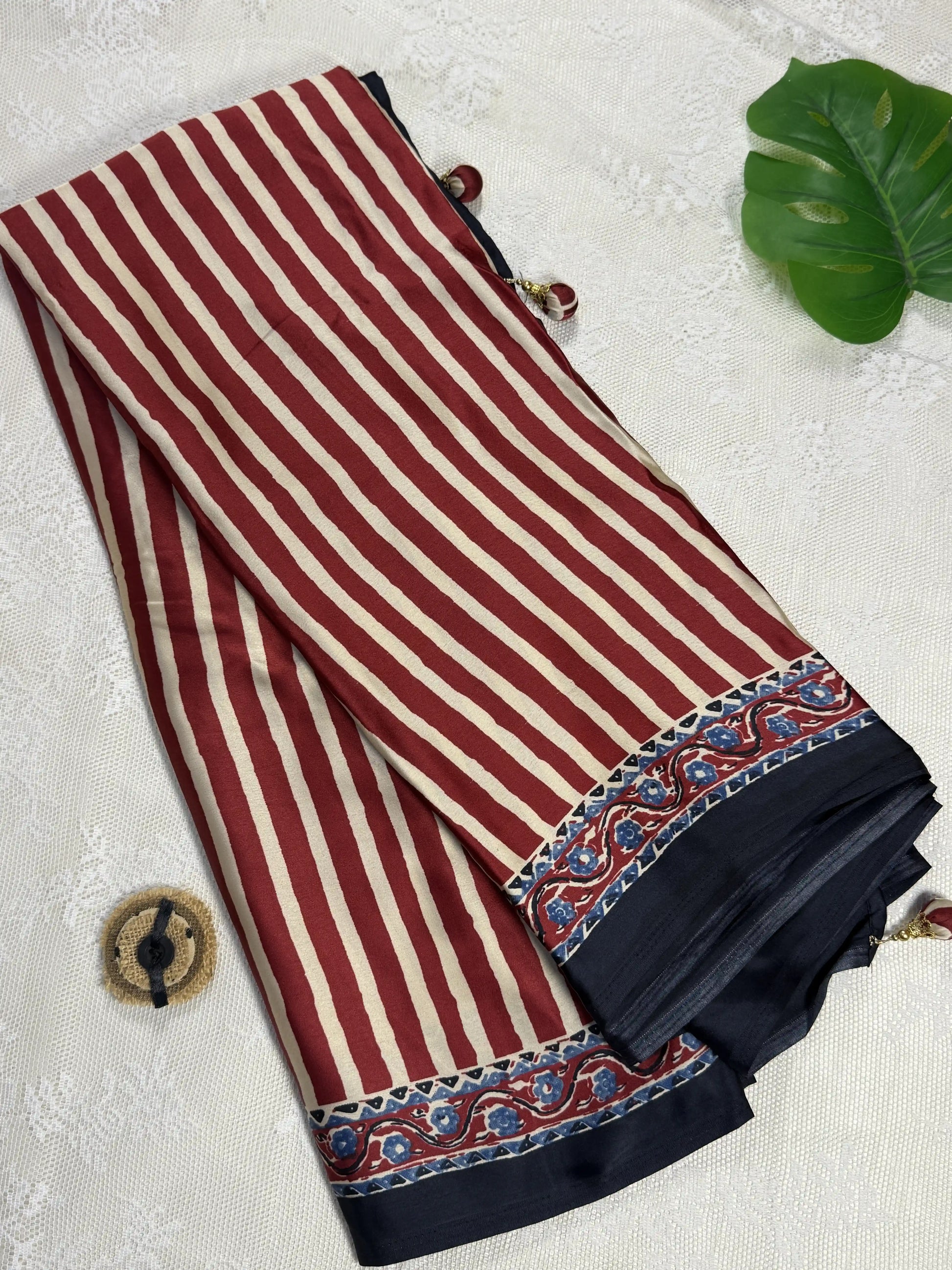 Empress Ajrakh Modal Satin Saree: Pale Gold, Red Stripped Saree with multi color ajrakh border and pallu