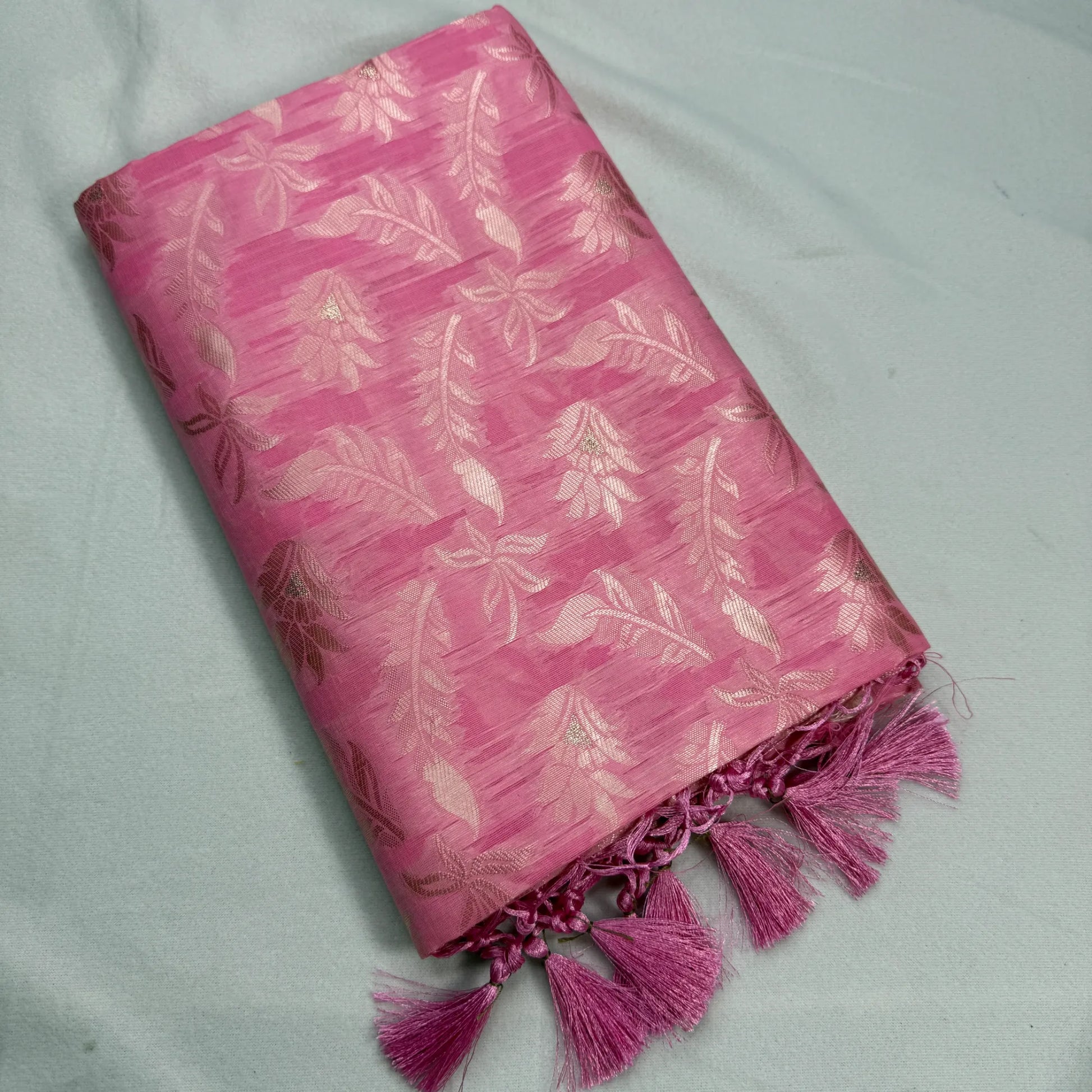 Make a statement with this beautiful vibrant pink Jacquard saree. Featuring intricate woven motifs of leaves and flowers across the body and a designer pallu with playful tassels, this saree is a perfect blend of modern style and traditional grace.