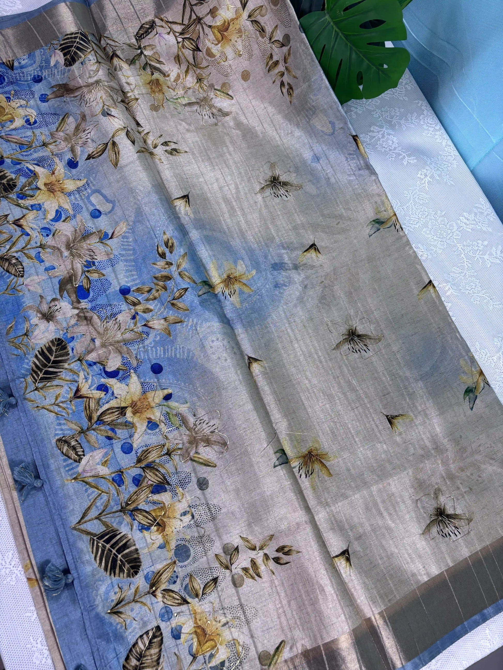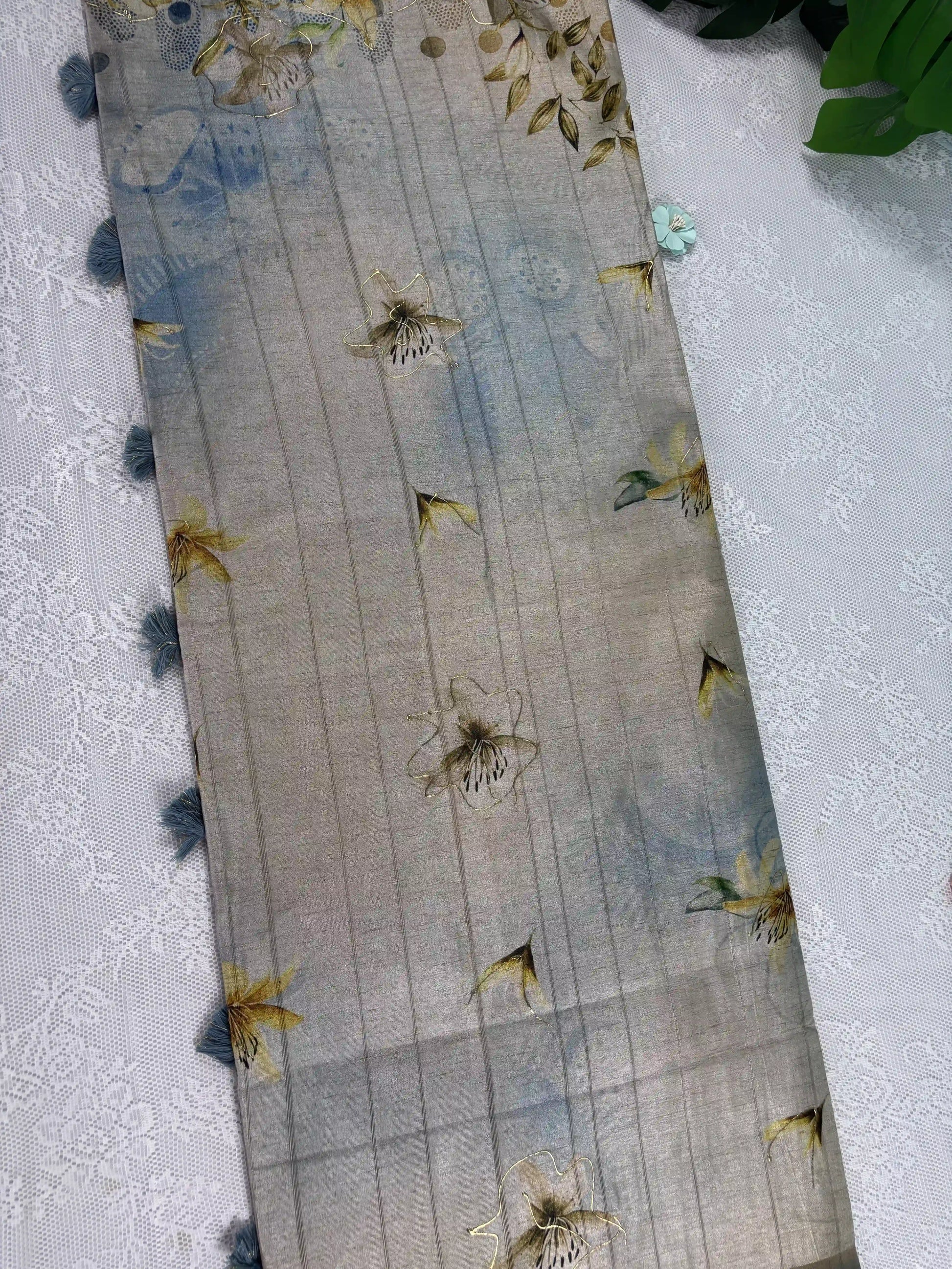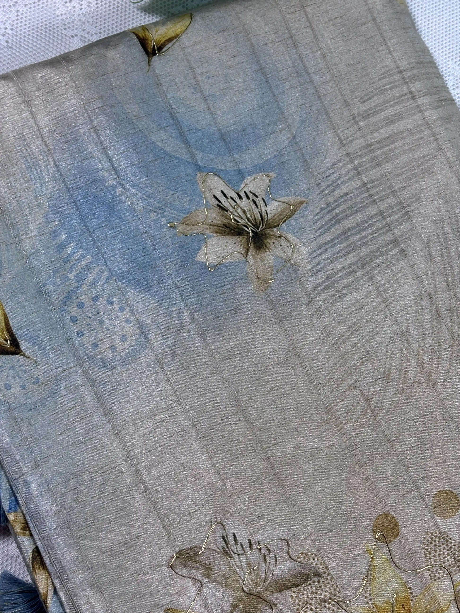 This exquisite Manipuri silk saree is a beautiful blend of lightweight comfort and artistic design. The soft gray and light blue body of the saree features a stunning floral print with elegant blossoms and leaves. The intricate, hand-painted style of the flowers and the subtle polka dot accents add a unique and modern touch. The woven border in a contrasting silver-grey shade adds a touch of classic sophistication, and the tassels on the pallu provide a playful detail. This graceful saree is a perfect choice for both casual daytime events and festive gatherings.