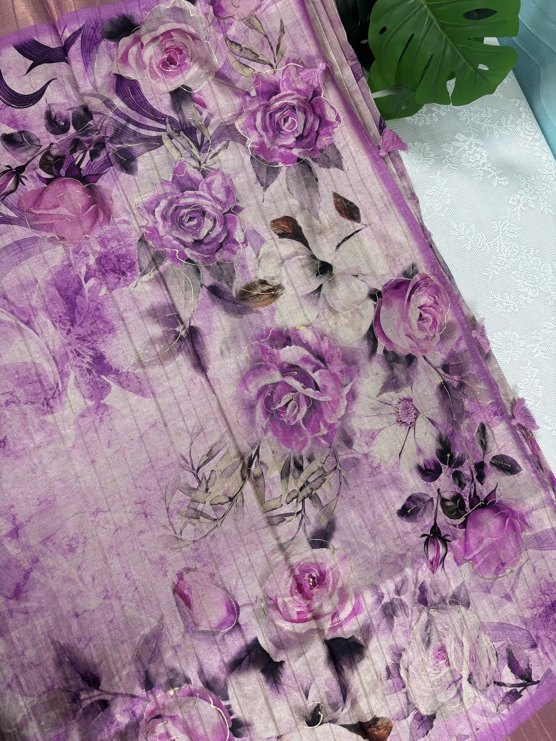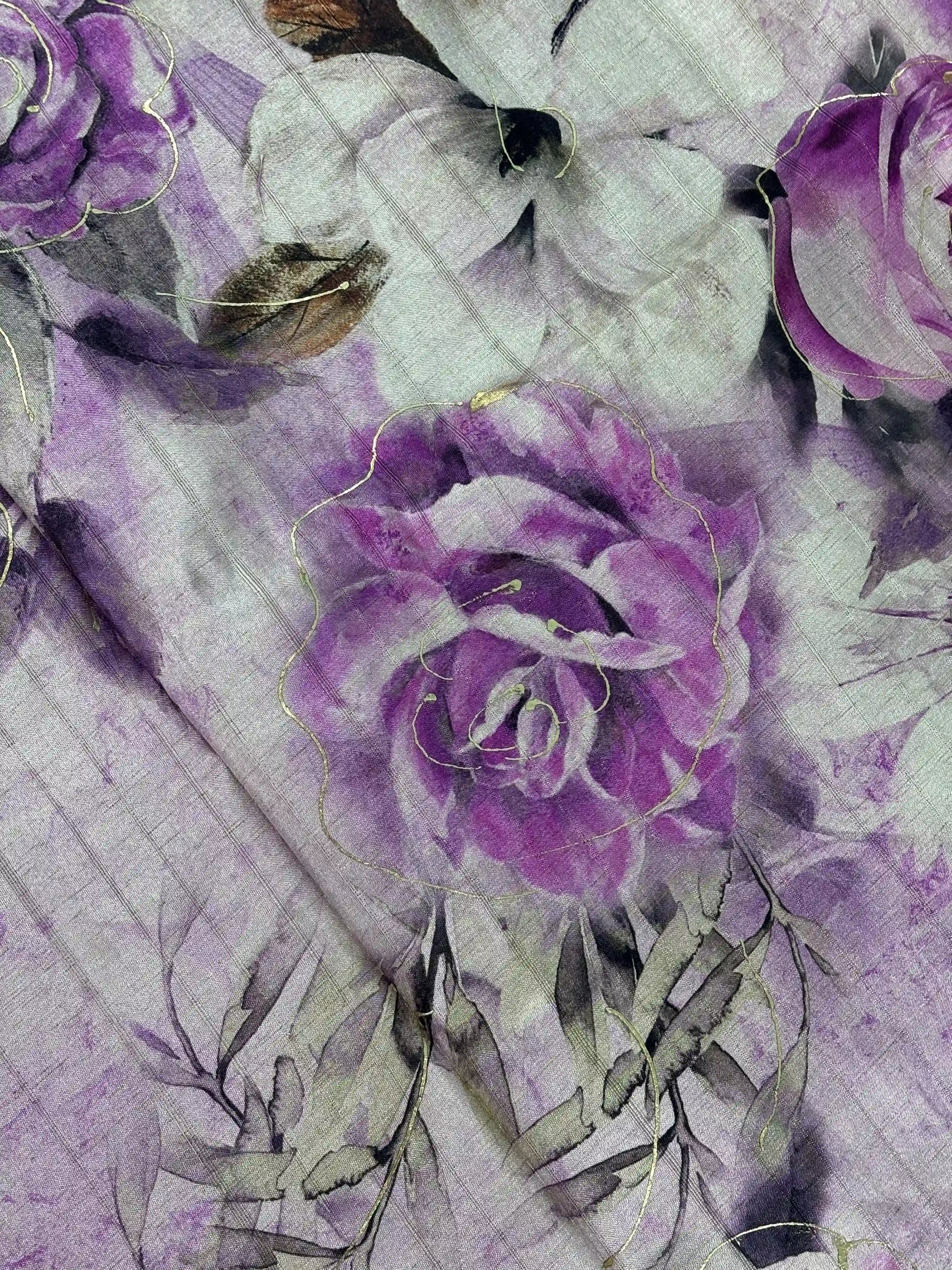 This exquisite Manipuri silk saree is a beautiful blend of lightweight comfort and artistic design. The light purple body of the saree features a stunning floral print with vibrant blossoms in shades of purple and pink. The intricate, watercolor-style print of the flowers and leaves adds a unique and modern touch. The woven border in a contrasting maroon shade adds a touch of classic sophistication, and the tassels on the pallu provide a playful detail. This graceful saree is a perfect choice for both casual daytime events and festive gatherings.