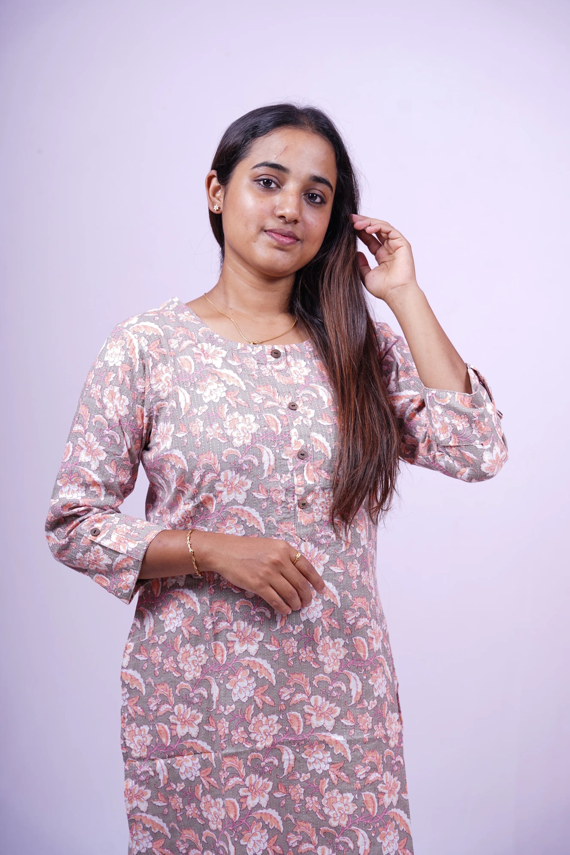 This charming gray kurthi is a perfect blend of delicate charm and traditional print. The kurthi features an intricate all-over floral print in shades of pink, orange, and white. It has a round neckline and a half-button placket with delicate pintuck detailing on the yoke. The three-quarter sleeves have buttoned tabs, adding a graceful and comfortable feel. This piece is a perfect blend of a subtle color and a detailed print, making it an ideal choice for everyday wear or casual gatherings.