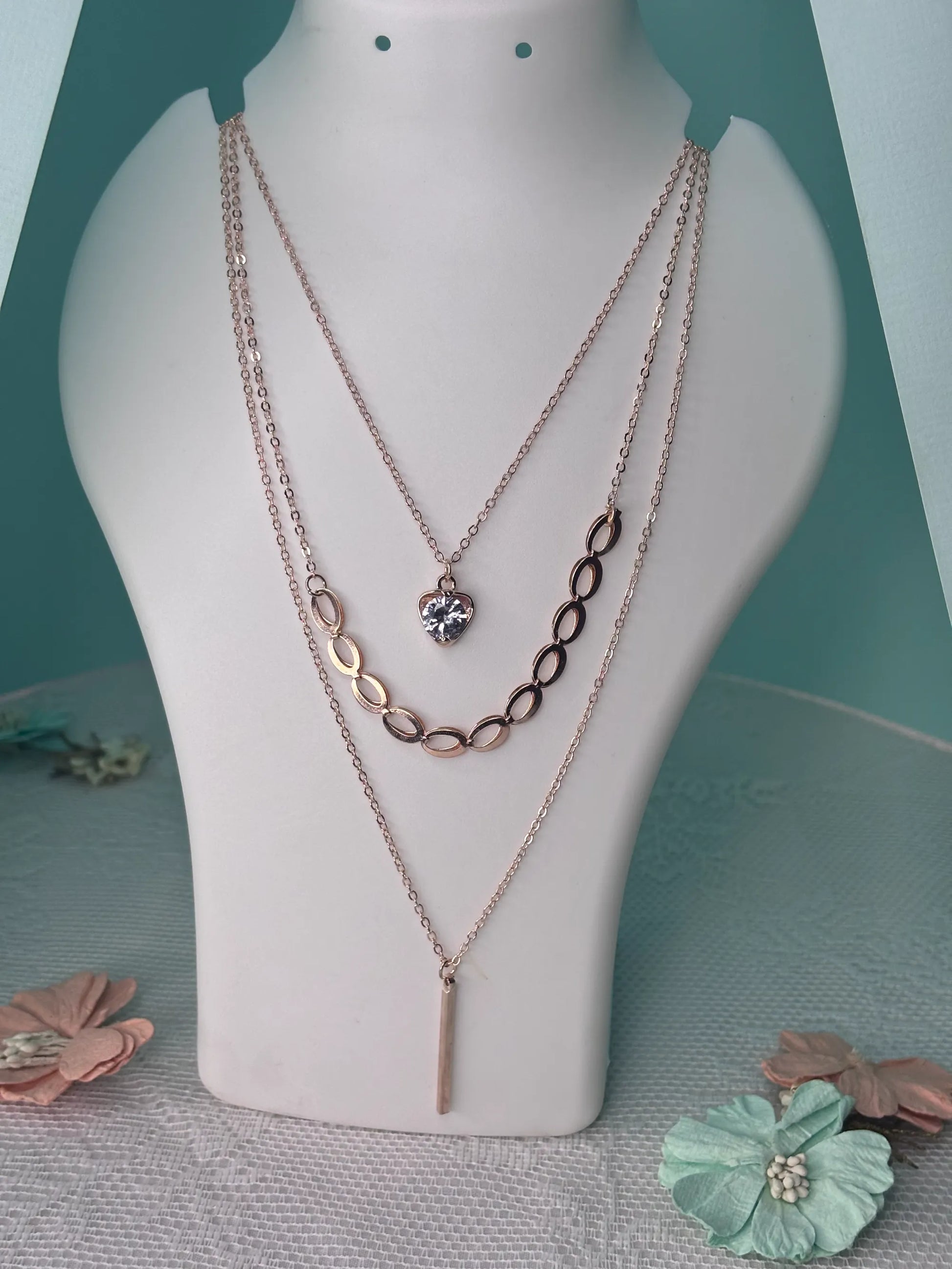 This elegant, three-tiered layered necklace is the perfect blend of modern style and delicate charm. Each tier offers a unique design element. The top chain features a sleek bar pendant, while the middle chain showcases a beautiful, elongated oval link pattern. The bottom and longest chain has a delicate, heart-shaped pendant completely encrusted with shimmering cubic zirconia (CZ) stones. The entire necklace is finished in a beautiful rose gold tone, making it a versatile accessory for adding a touch of sophisticated glamour to any outfit.