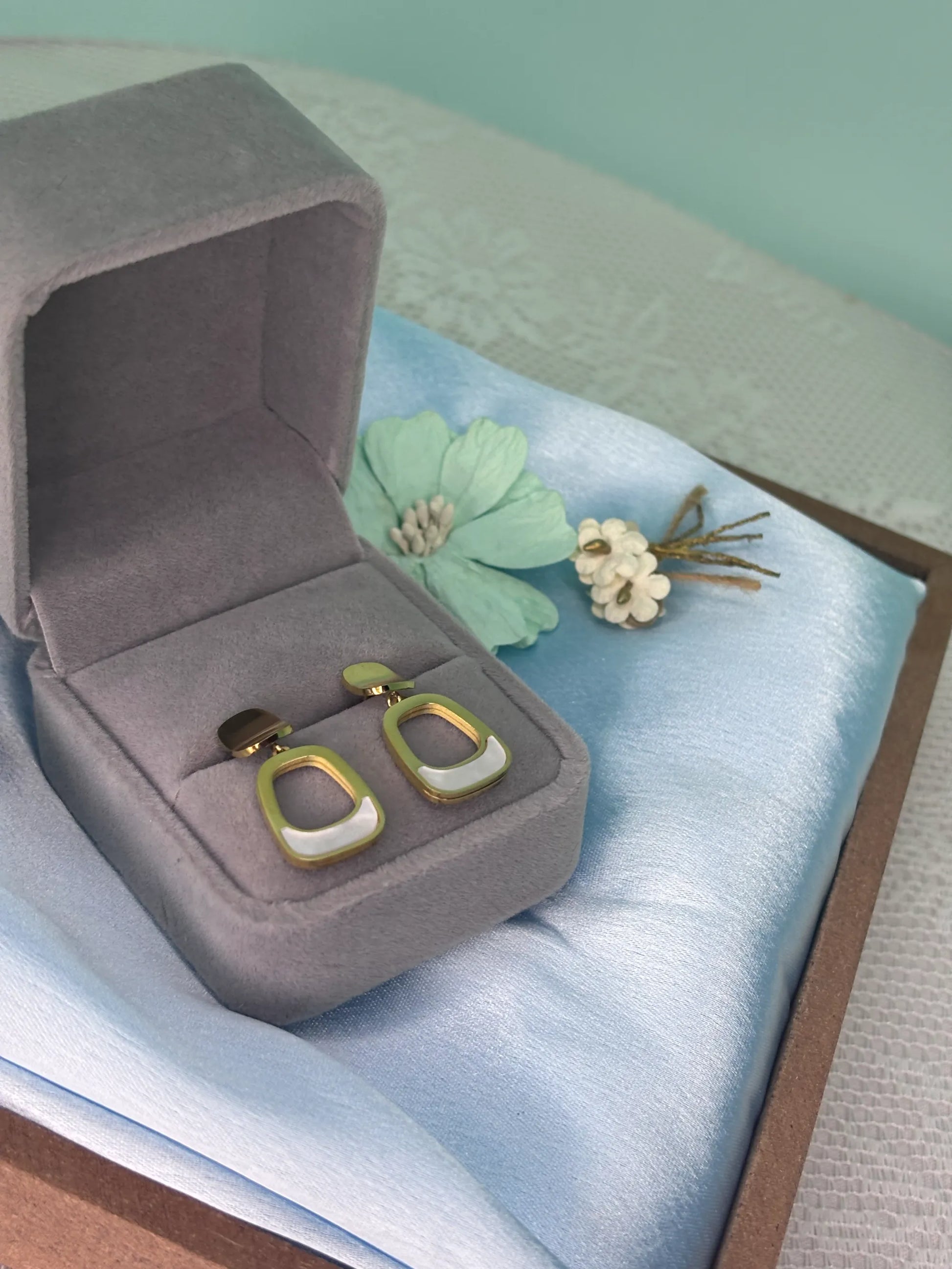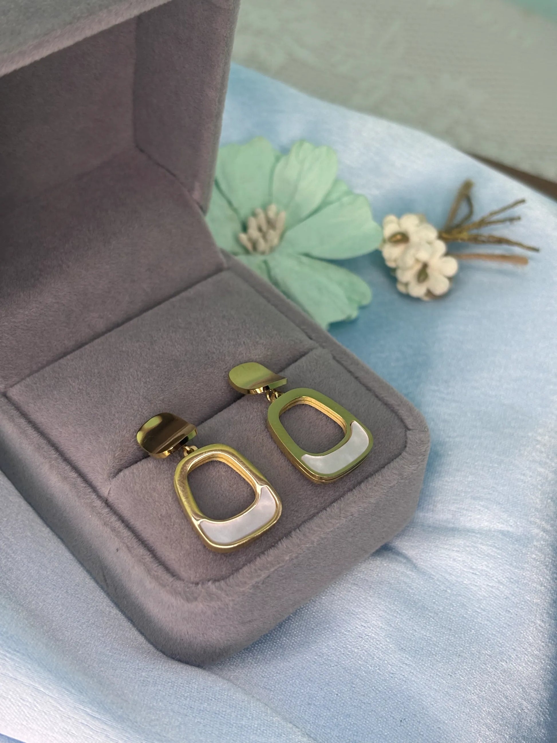 These sleek and modern drop earrings make a unique, contemporary statement. Each earring features a polished golden stud, from which a graceful, teardrop-shaped dangle hangs. The dangle has a hollow center with a lustrous mother-of-pearl inlay, which shimmers with a soft, iridescent glow. The minimalist design and polished finish make these earrings a versatile accessory, perfect for adding a touch of modern elegance to both professional and evening outfits.