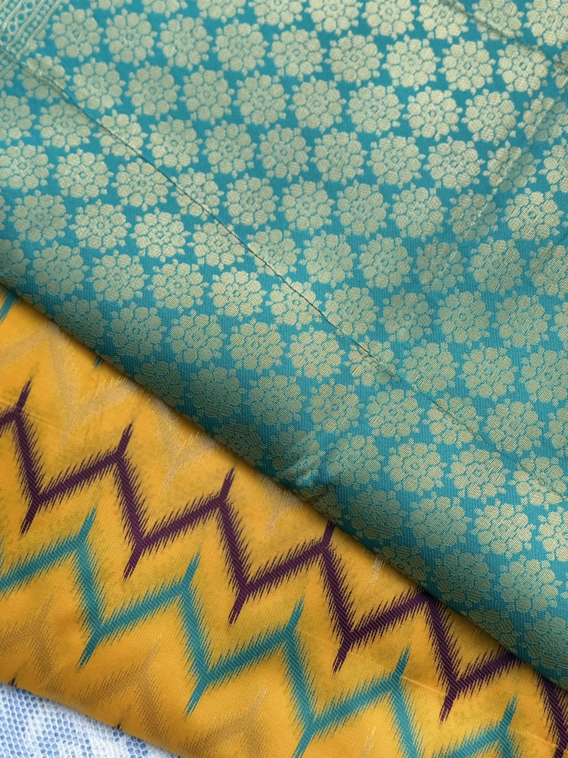 Pochampalli Soft Silk: Yellow Purple Saree with Pochampalli Elephant Motif with Teal Green Border