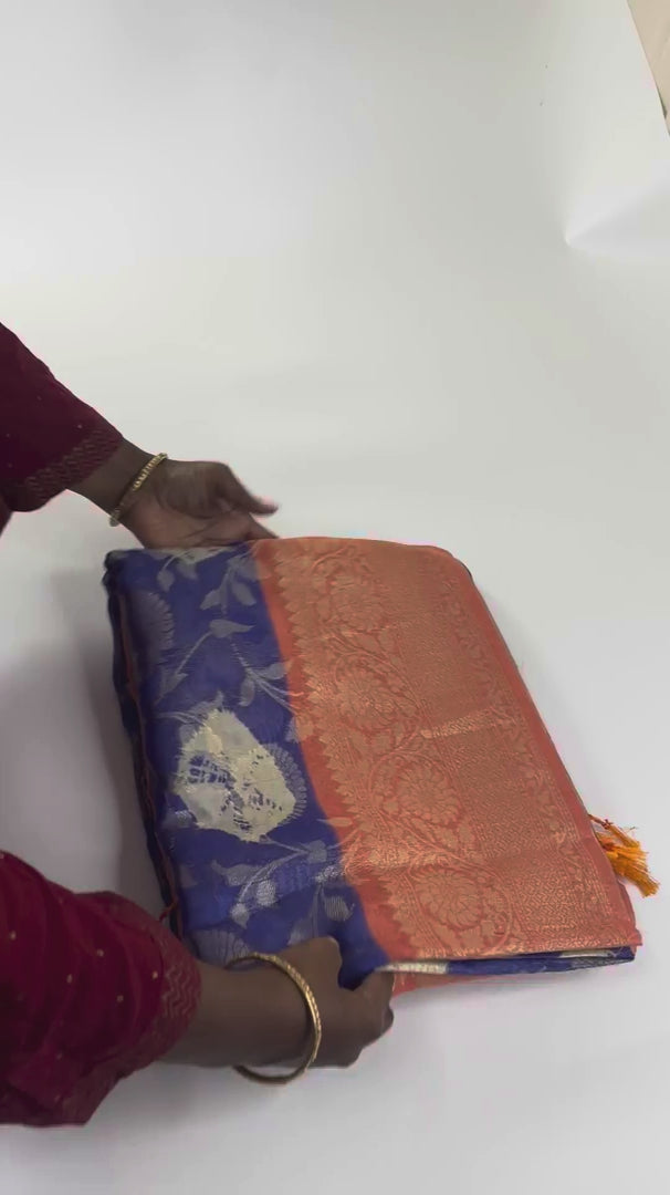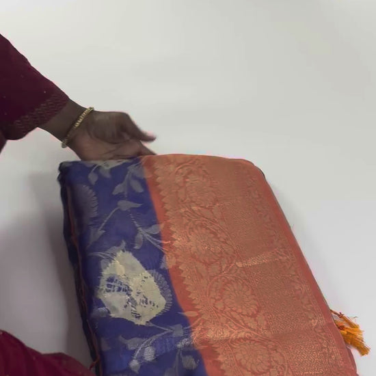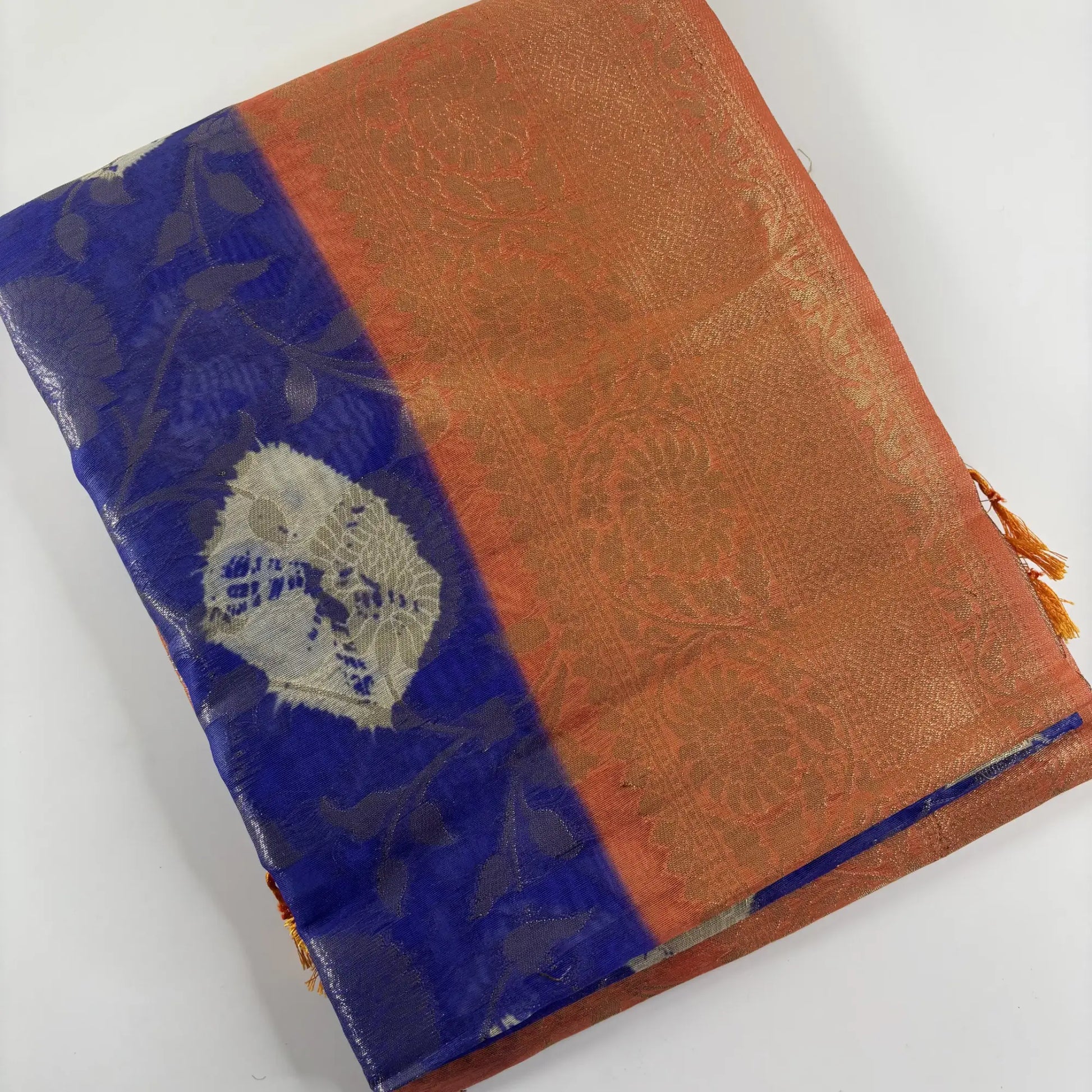 Make a grand statement with this exquisite fancy saree, a celebration of bold color and rich texture. The body of the saree is a striking cobalt blue, adorned with intricate floral and leaf motifs woven in a subtle golden thread. The tissue-like fabric lends a lightweight and ethereal feel, making it a dream to drape. The showstopper is the rich, contrasting orange Nakshatra pallu, adorned with detailed woven patterns that add a touch of celestial grandeur and sophistication.