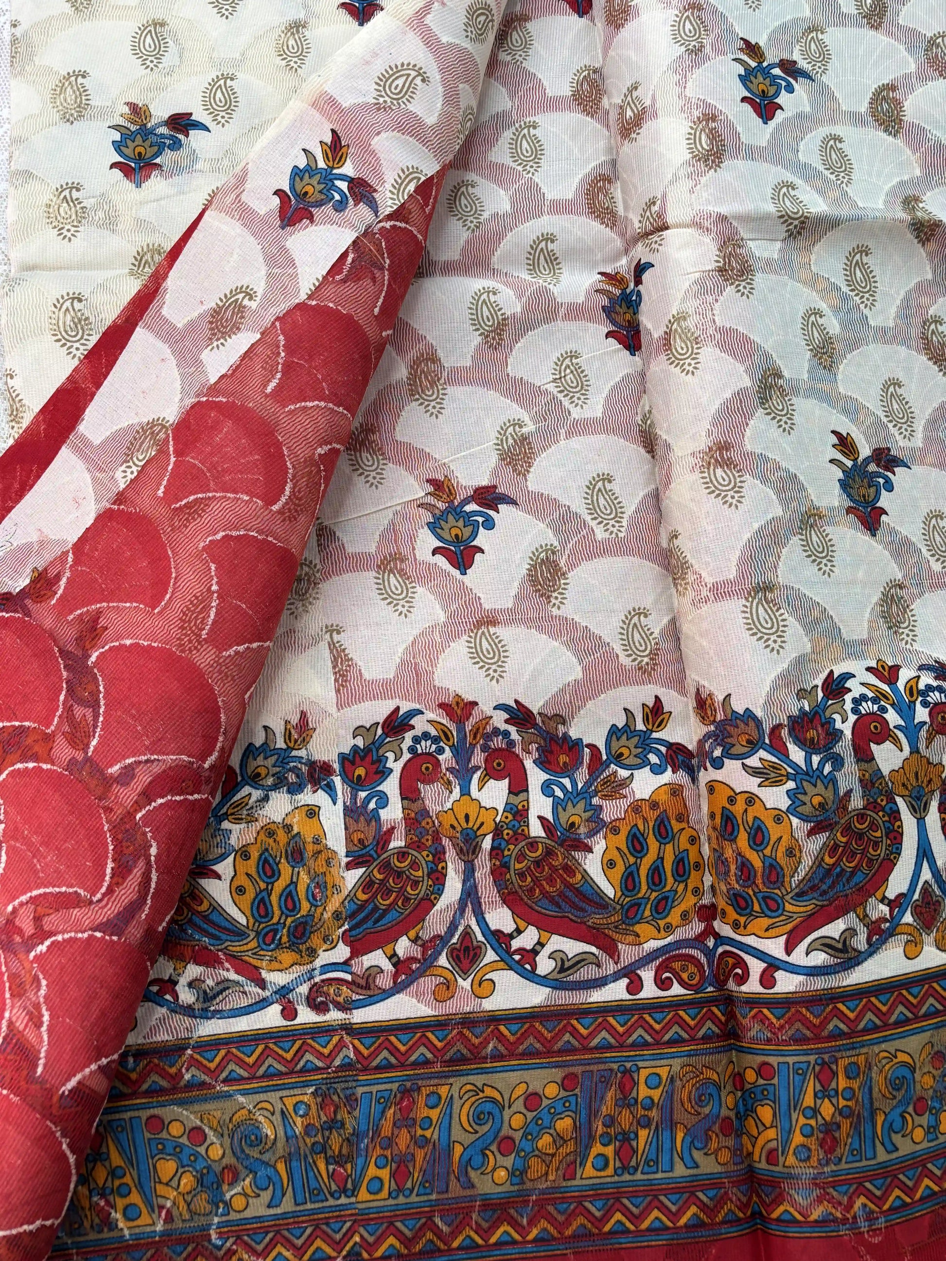 White Netted Cotton Saree with Red, Blue and Yellow Kalamkari Print, Netted Butta and Red Border and Pallu