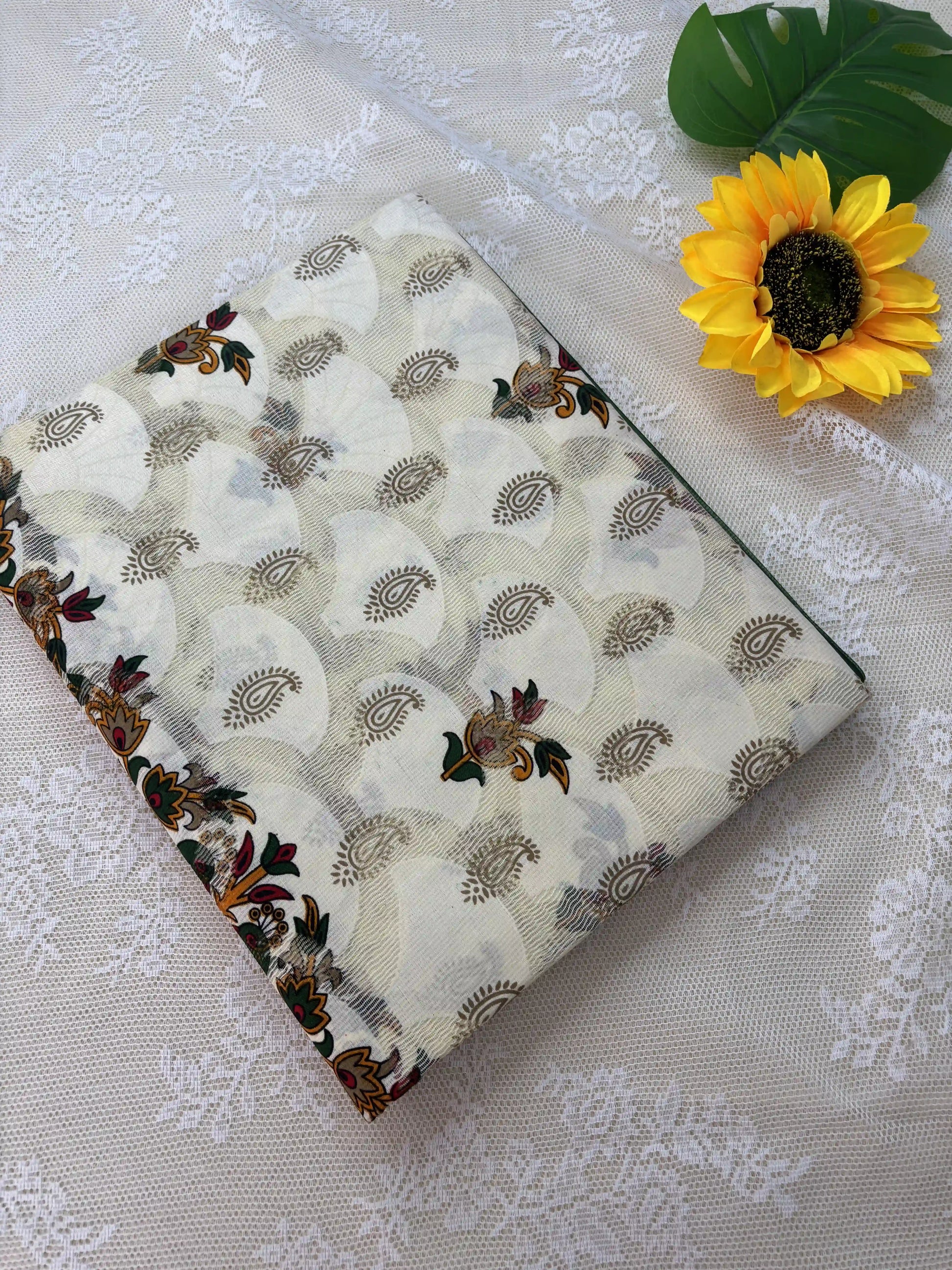White Netted Cotton Saree with Red, Blue and Yellow Kalamkari Print, Netted Butta and Green Border and Pallu