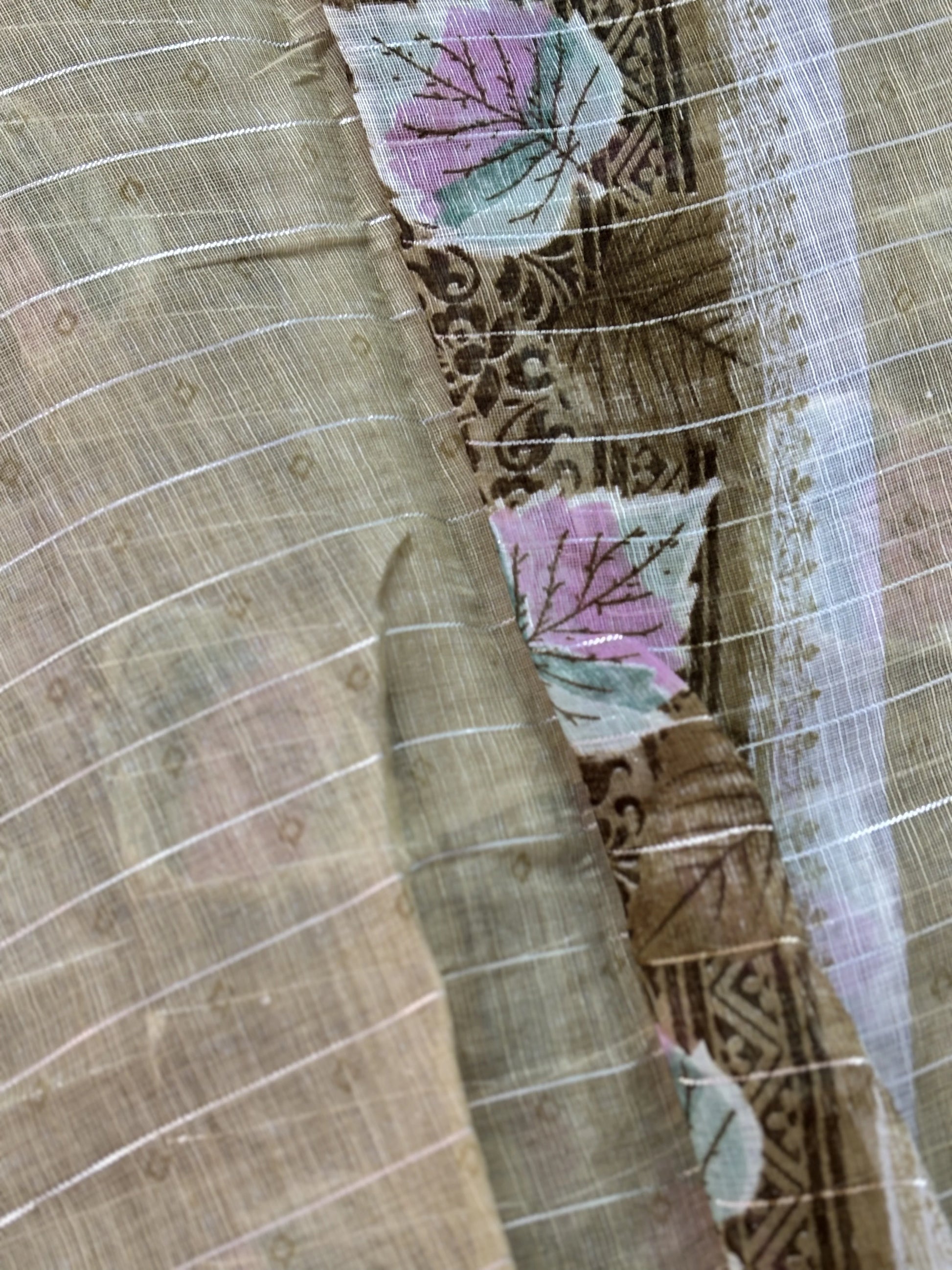 Mustard yellow digital print with stripped silver zari body semi linen cotton saree