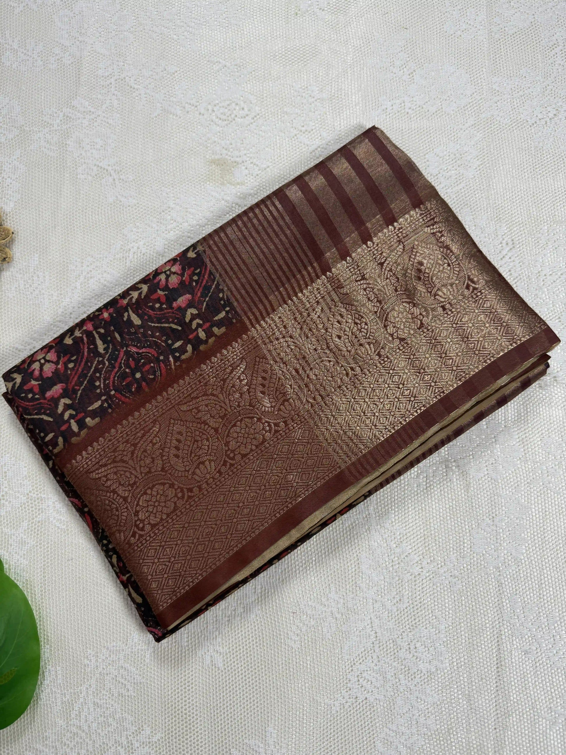 Mehendi Red Cotton Silk Saree with Gold Butta Body and Floral Motifs with Red and Gold Stripped Border and Pallu