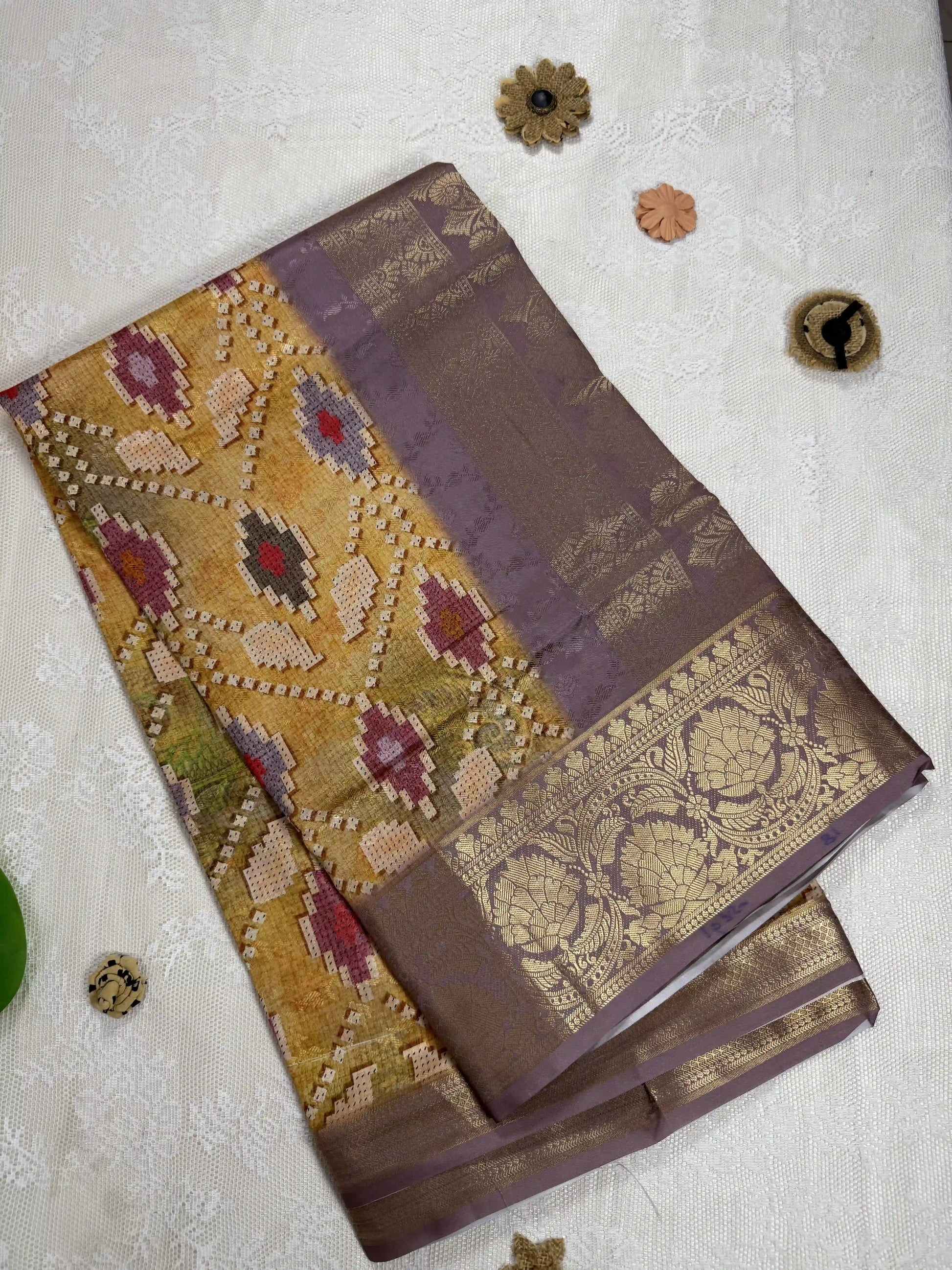 Gold Yellow Cotton Silk Saree with Leafy Textured Body and Tetris Block Motifs with Lavendar and Gold Border and Pallu