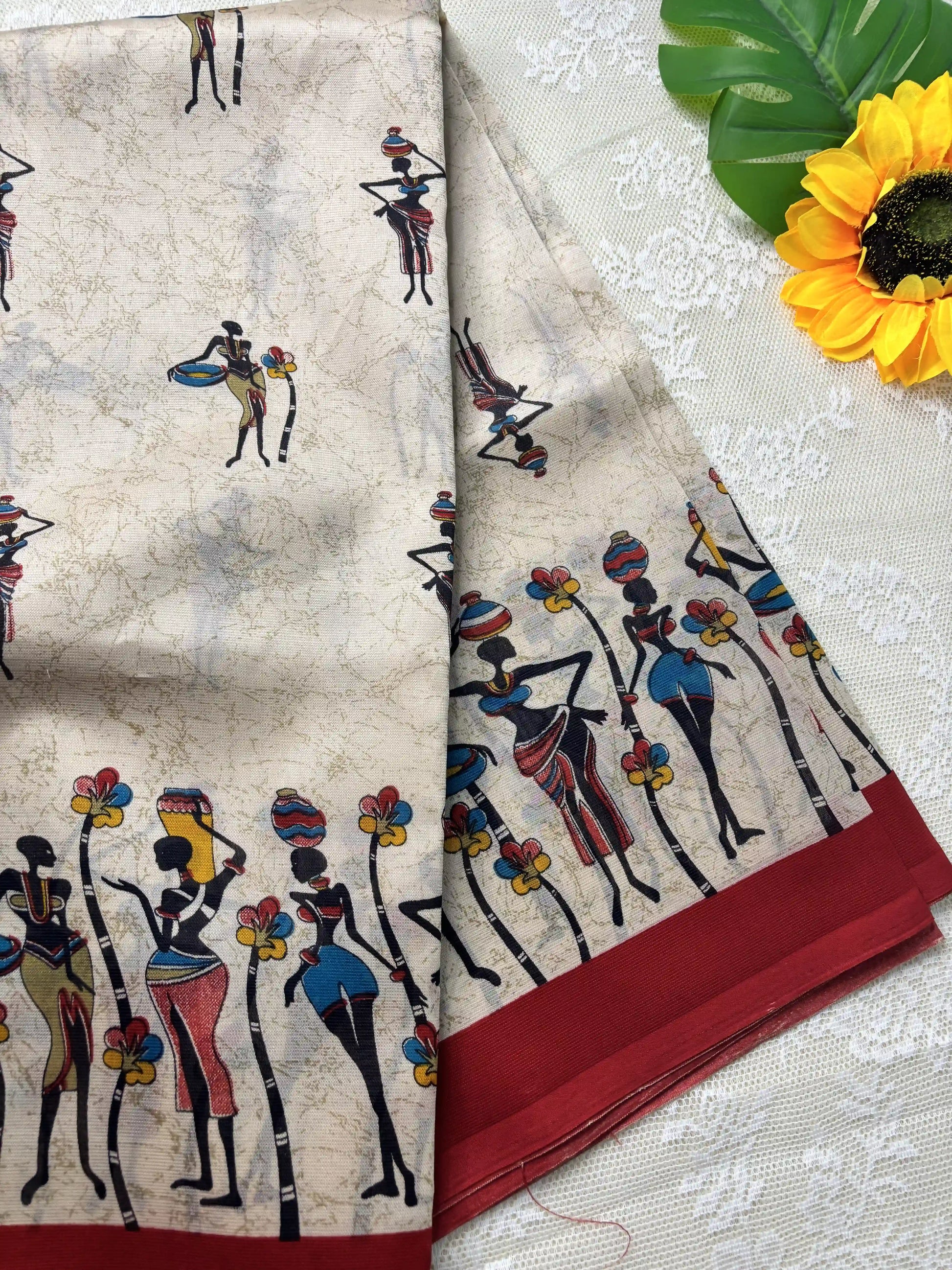 Beige Saree with African Tribal Print and Red Border Malabar Silk