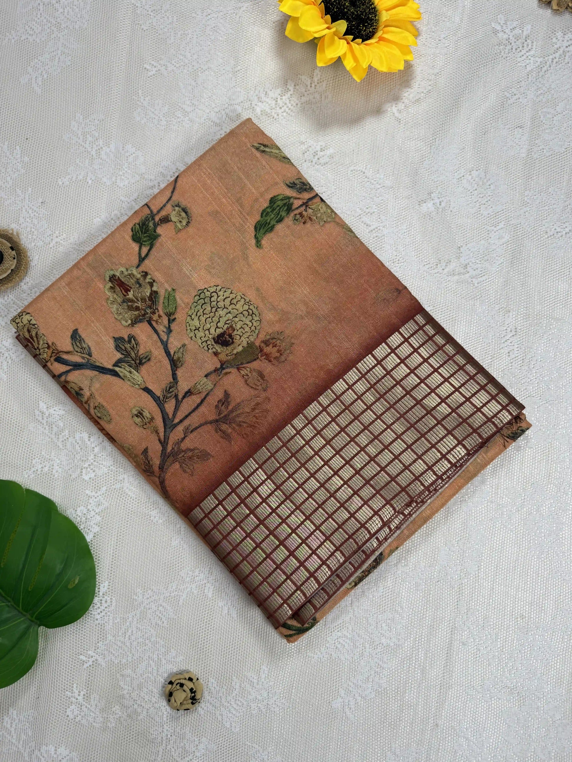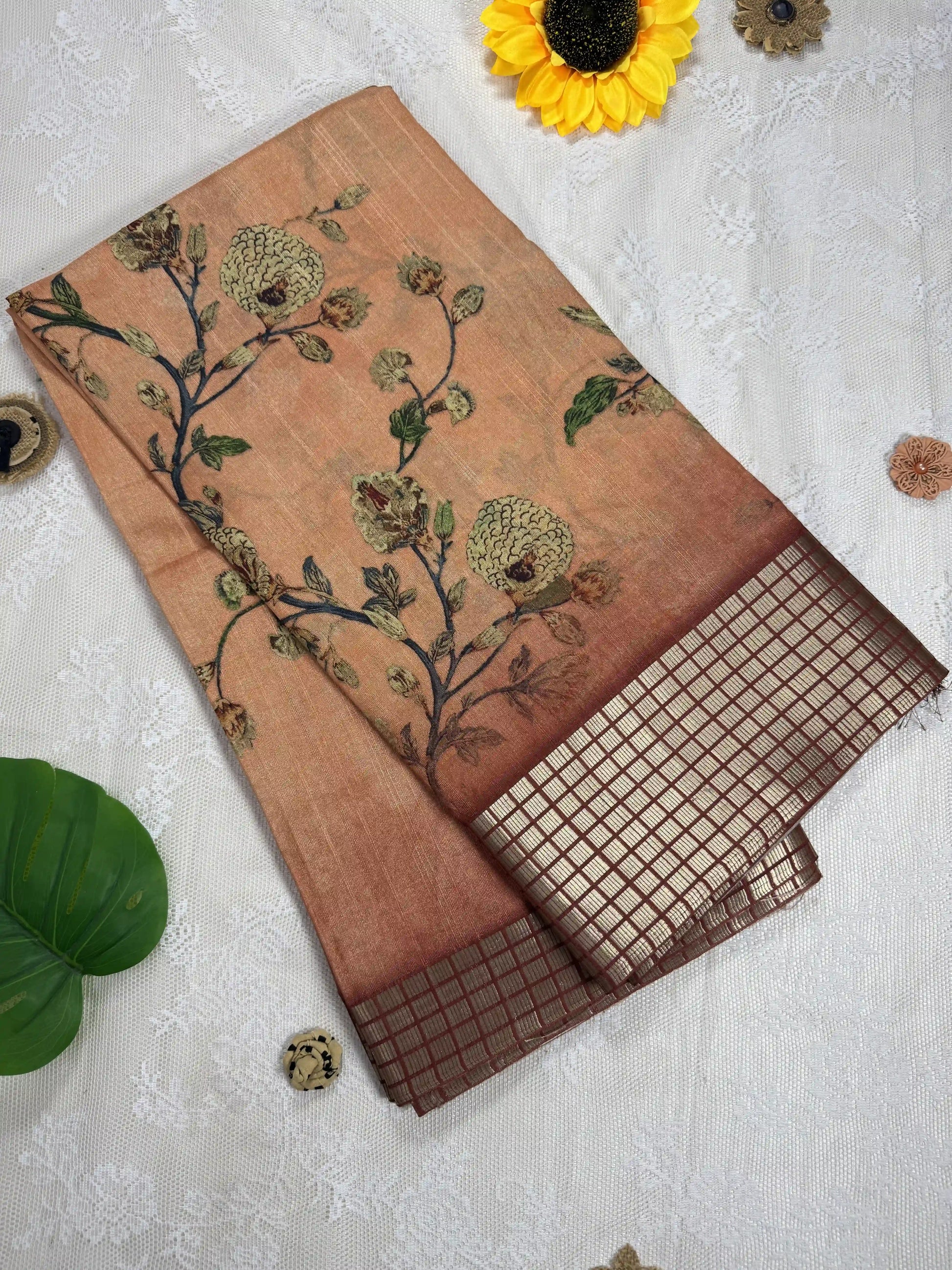Orange Tassar Silk Saree with Floral design body and red border with gold barcode zari work