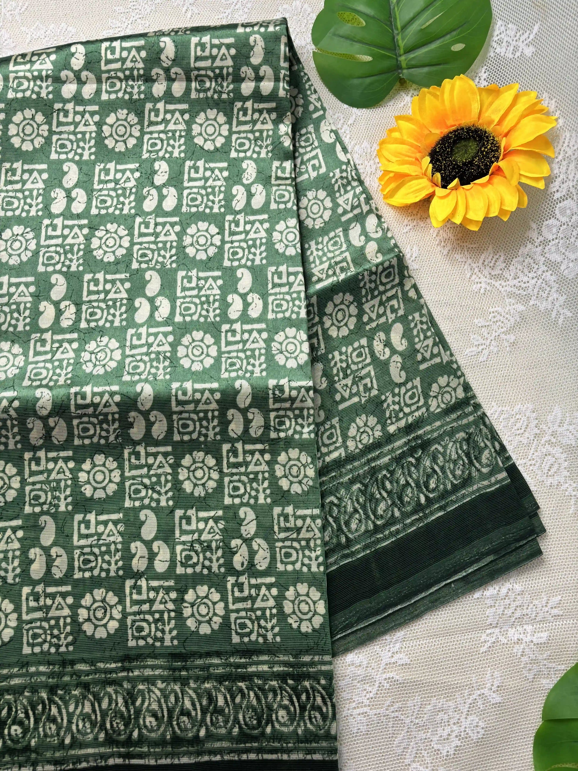 Green Silk Soft Cotton Saree with block print pattern print Body and mango pattern Border and pallu
