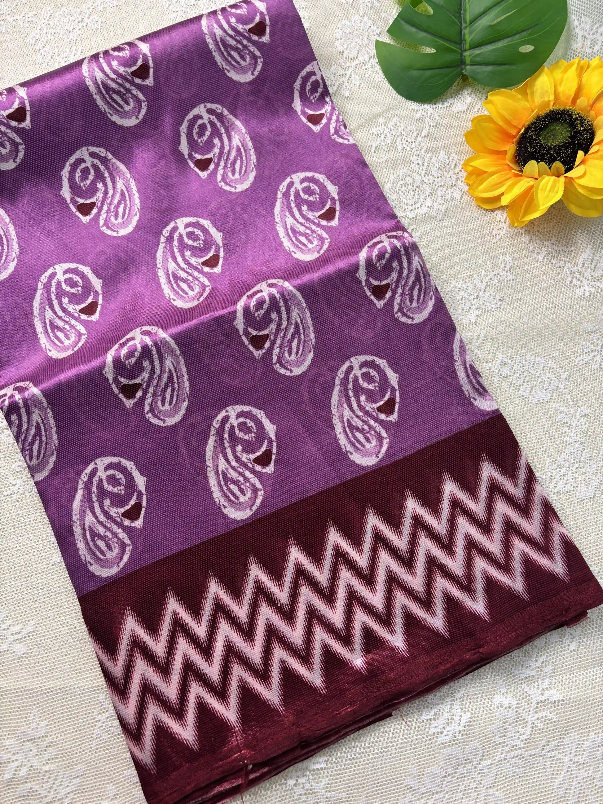 Pink Silk Soft Cotton Saree with Mango Motif Body and Zig Zag pattern Red Border and pallu