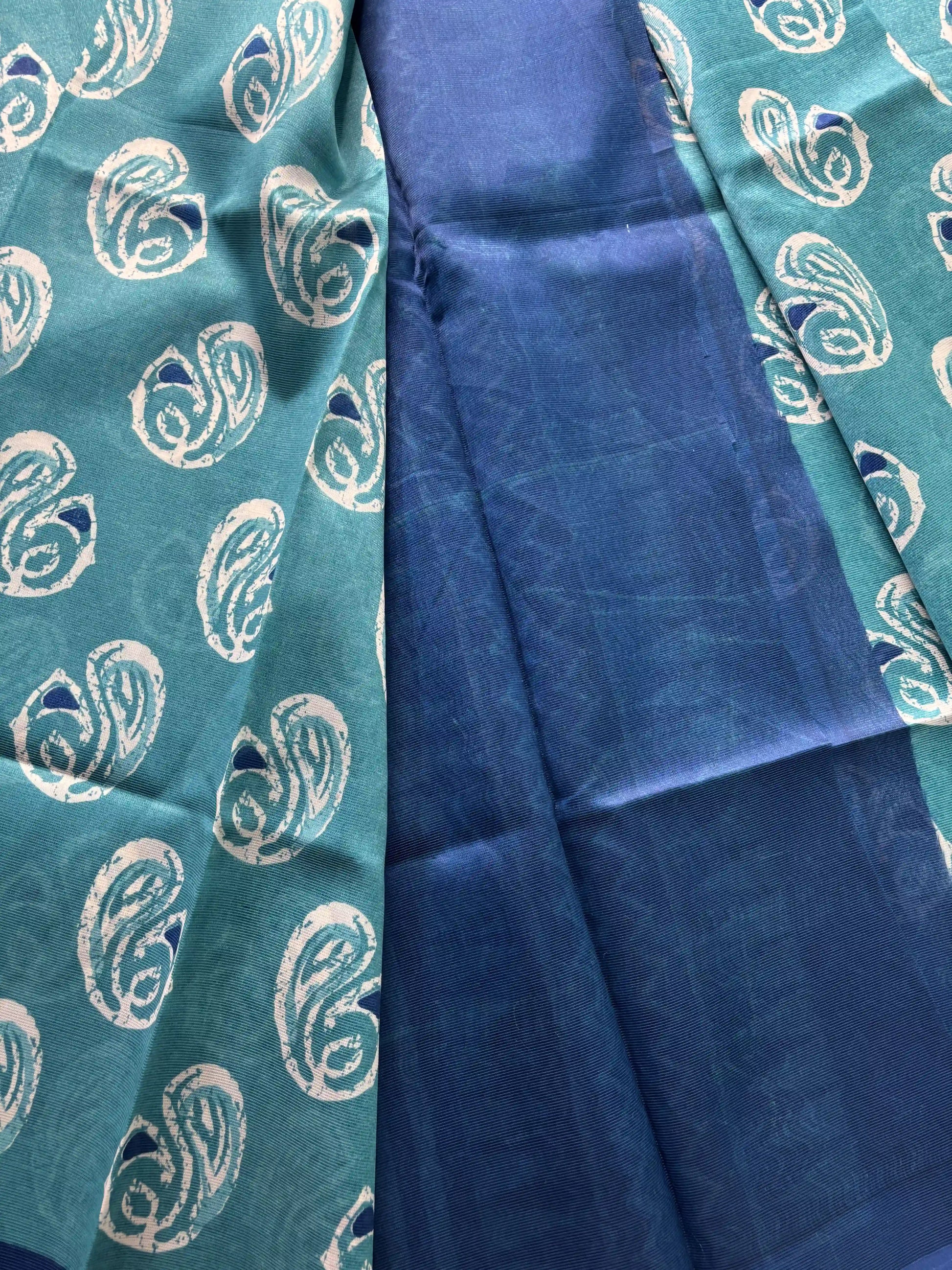 Bright Teal Blue Silk Soft Cotton Saree with Mango Motif Body and Zig Zag pattern Navy Blue Border and pallu
