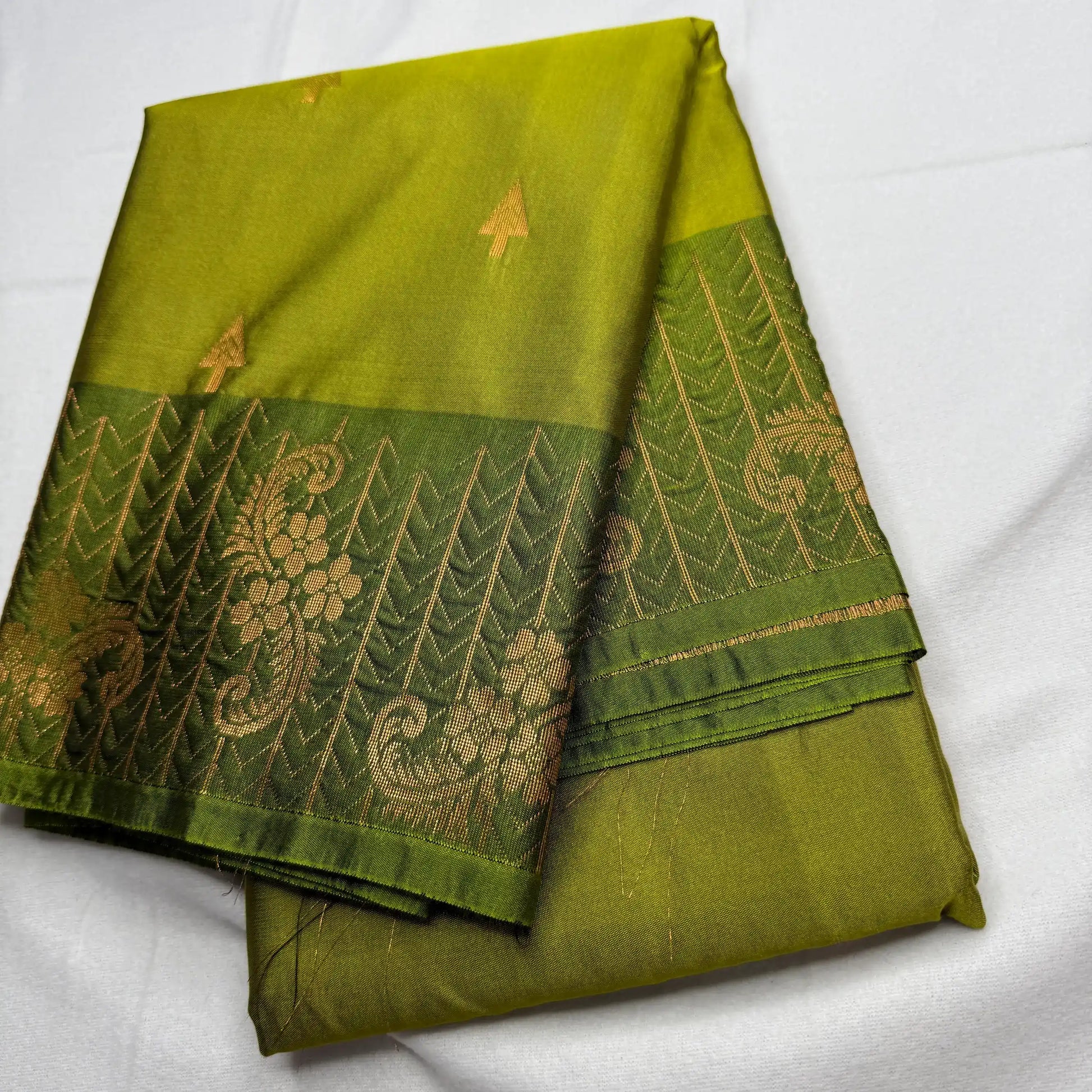Discover an elegant play of color and traditional weaving in this beautiful soft silk saree. The vibrant light green body is adorned with subtle, woven arrow motifs in a shimmering golden thread. This is perfectly complemented by a dark green border, which features a dense, intricate pattern of chevrons and floral vines. The rich colors and fine weaving make this saree a perfect blend of understated style and timeless elegance.