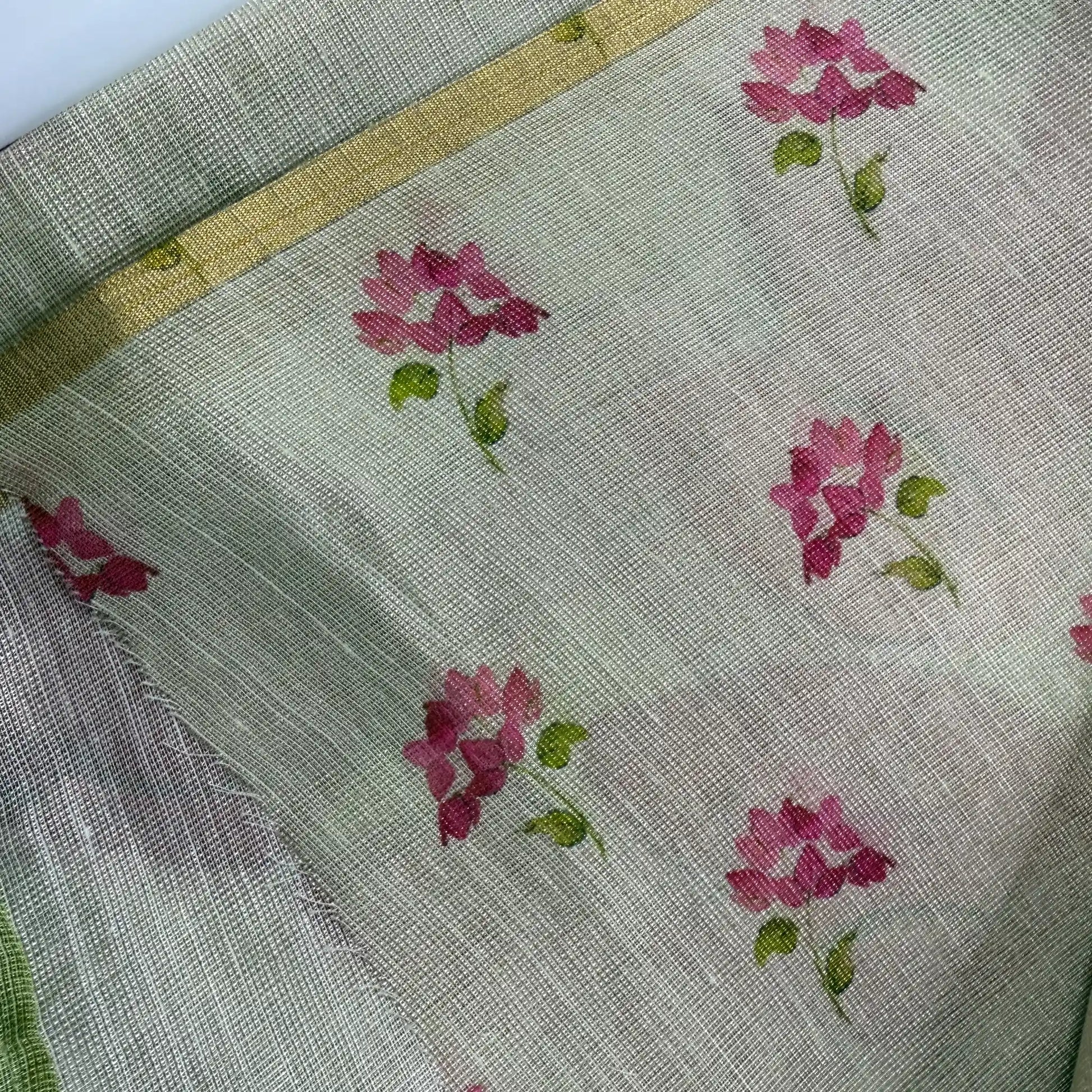 Drape yourself in elegance with this beautiful saree, a perfect blend of sophisticated color and artistic design. This fancy cotton silk saree, in a stunning beige hue, is adorned with an exquisite digital print of vibrant pink floral blossoms and delicate green leaves scattered across the body. The saree is completed with a rich gold and green border, and features tassels on the pallu for a classic finish. The saree's lightweight fabric offers a comfortable feel and a subtle sheen, making it an ideal choice for both casual gatherings and special occasions.