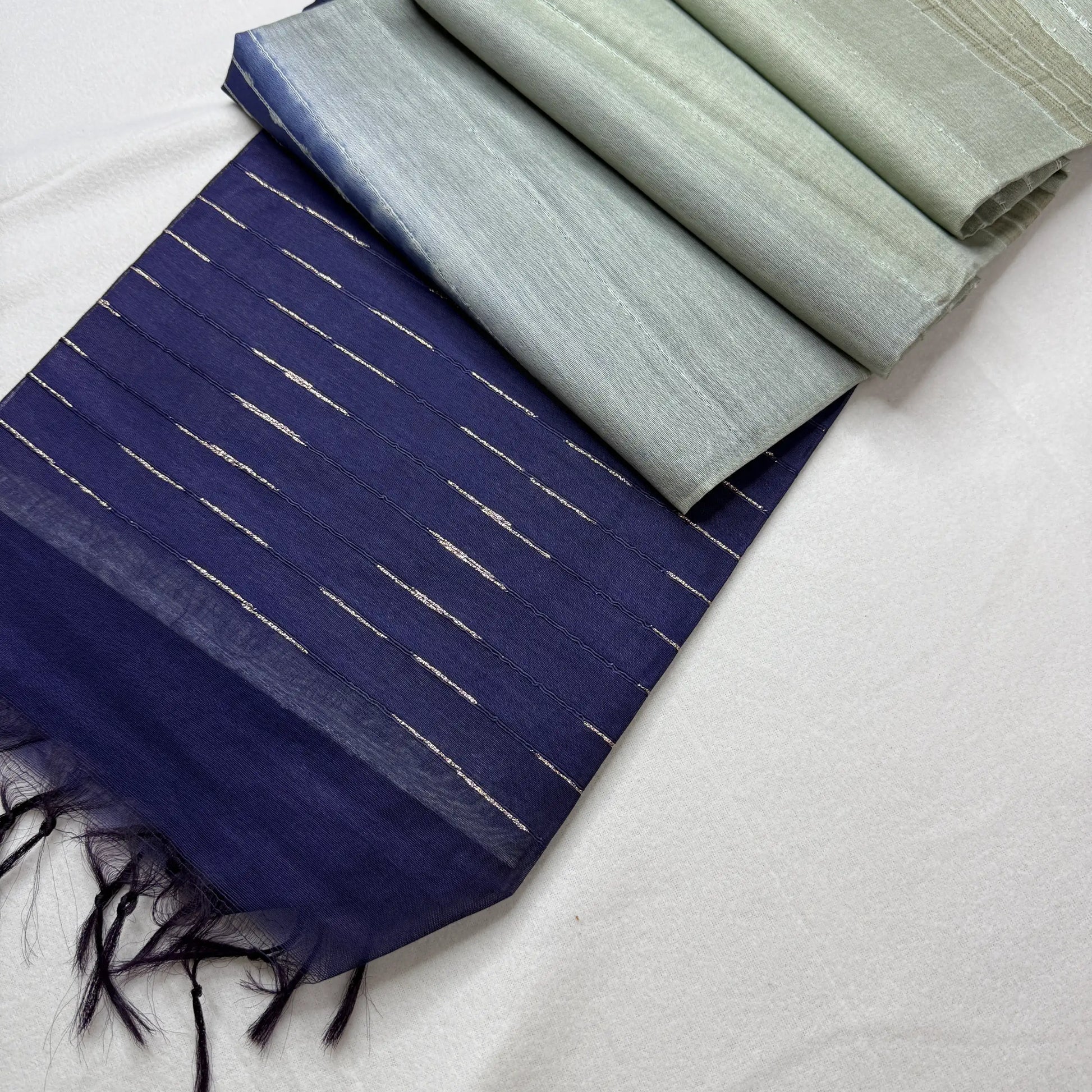 Indigo Blue & Sage Green – Raw Silk Saree with Striped Weave -SKU: F0-003