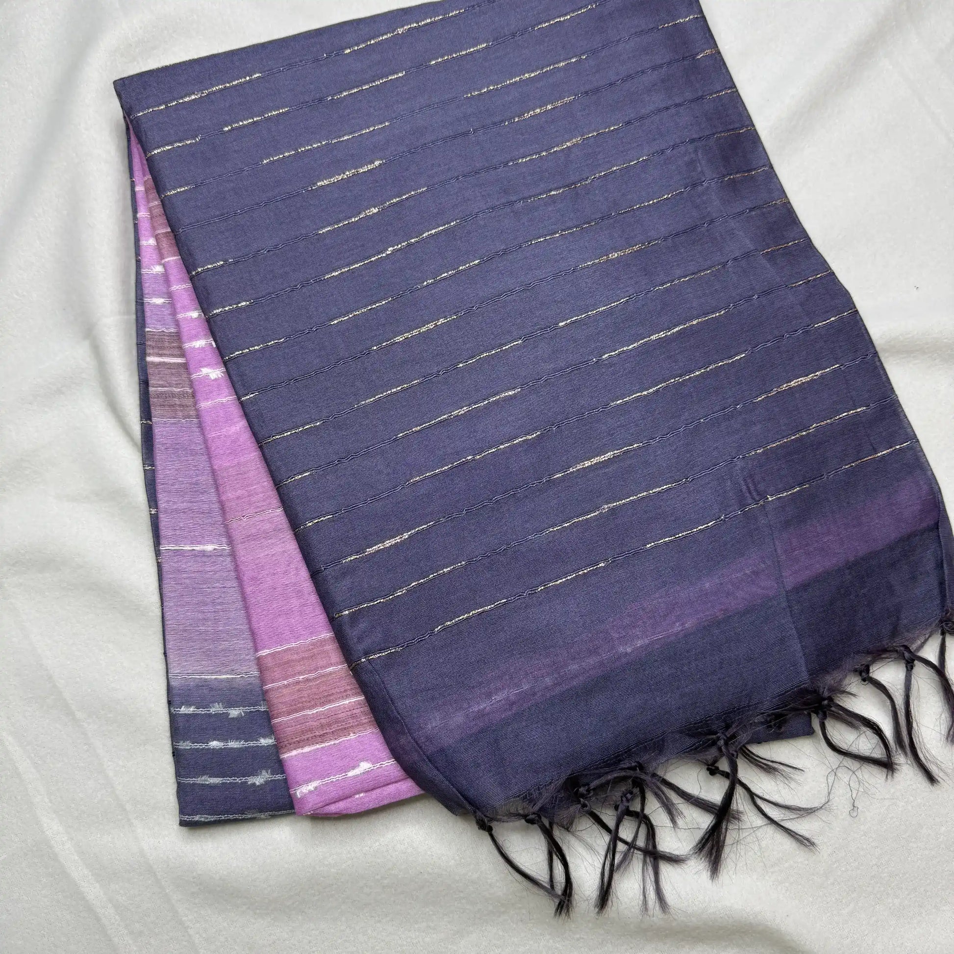 Pallu: Ombre effect of purple, lilac, and grey with matching stripes.