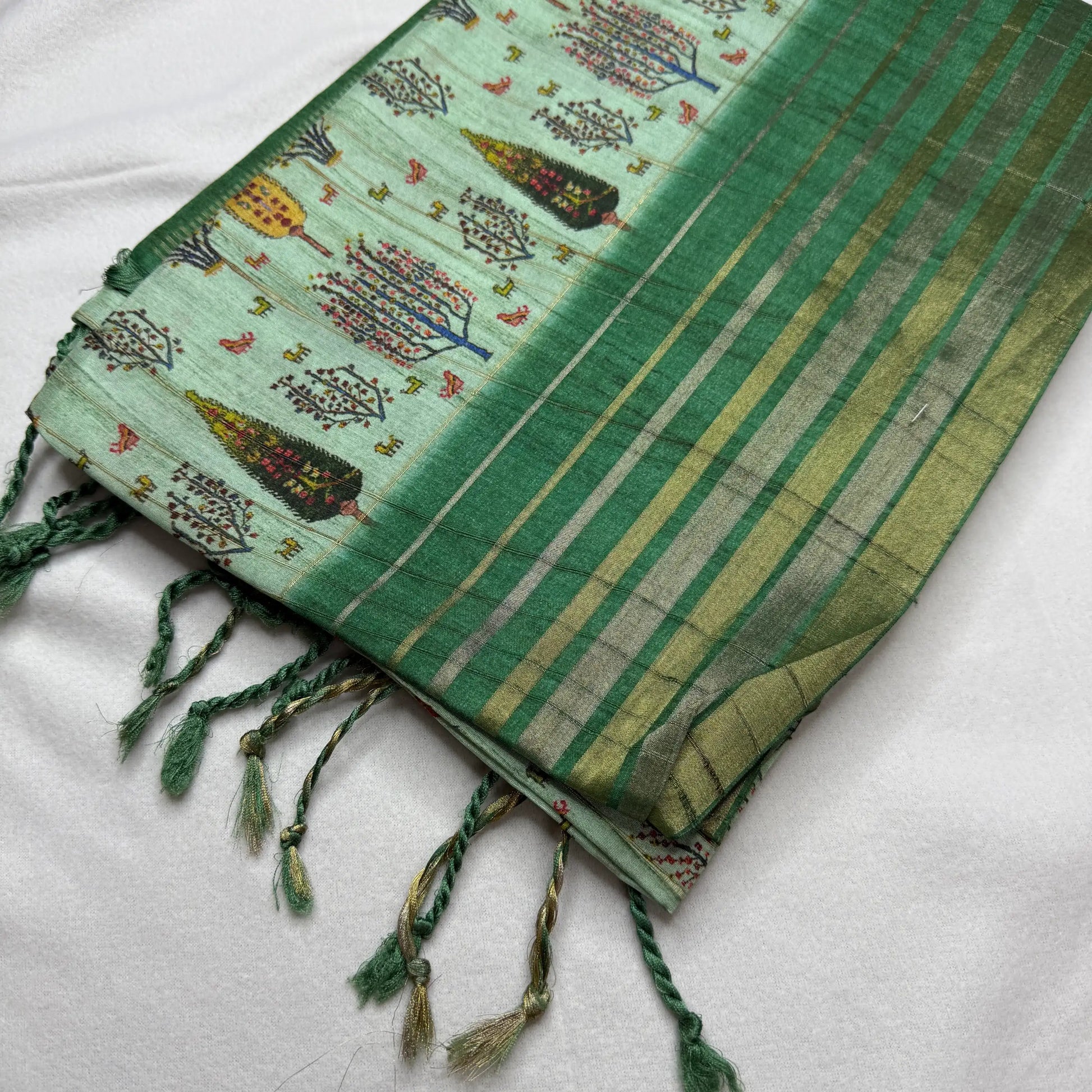 Discover the serene beauty of this unique Dupian Tussar saree. The light seafoam green body is adorned with an artistic print of multi-colored trees, creating a captivating and elegant look. This is beautifully contrasted by a pallu and border in a rich forest green, featuring elegant woven horizontal stripes in various shades of green and gold. The tassels add a final touch of sophistication, and the natural texture of the fabric enhances its traditional appeal.