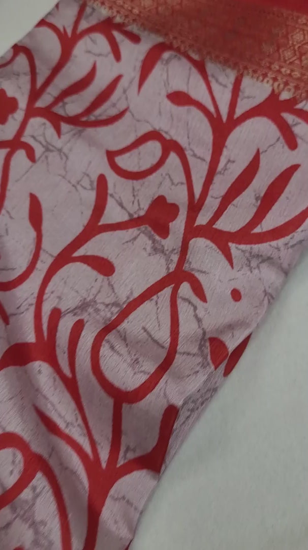Make a striking statement with this elegant saree that beautifully blends comfort and tradition. It features a serene greyish-blue body with a bold, hand-block-style print of vibrant red floral and vine motifs. The design is perfectly balanced by a wide, woven border in a rich red, adorned with intricate geometric patterns in golden thread, making it a perfect choice for both casual and festive occasions.