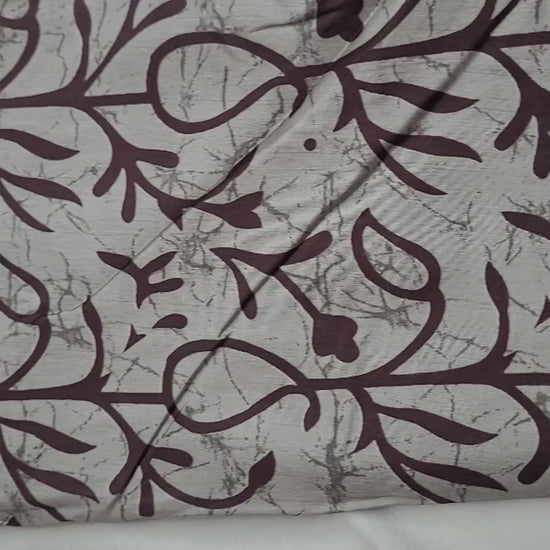 Make a striking statement with this elegant saree that beautifully blends comfort and tradition. It features a serene greyish-blue body with a bold, hand-block-style print of rich maroon floral and vine motifs. The design is perfectly balanced by a wide, woven border in a deep maroon, adorned with intricate geometric patterns in golden thread, making it a perfect choice for both casual and festive occasions.