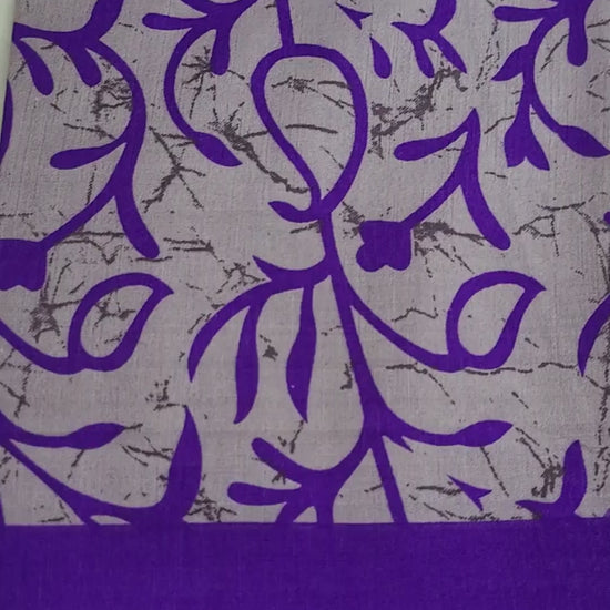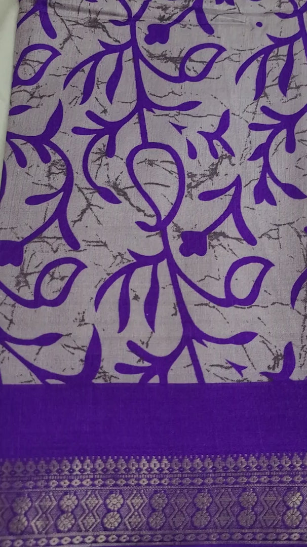 Make a striking statement with this elegant saree that beautifully blends comfort and tradition. It features a serene greyish-blue body with a bold, hand-block-style print of purple floral and vine motifs. The design is perfectly balanced by a rich, wide woven border in a vibrant purple, adorned with intricate geometric and floral patterns, making it a perfect choice for both casual and festive occasions.