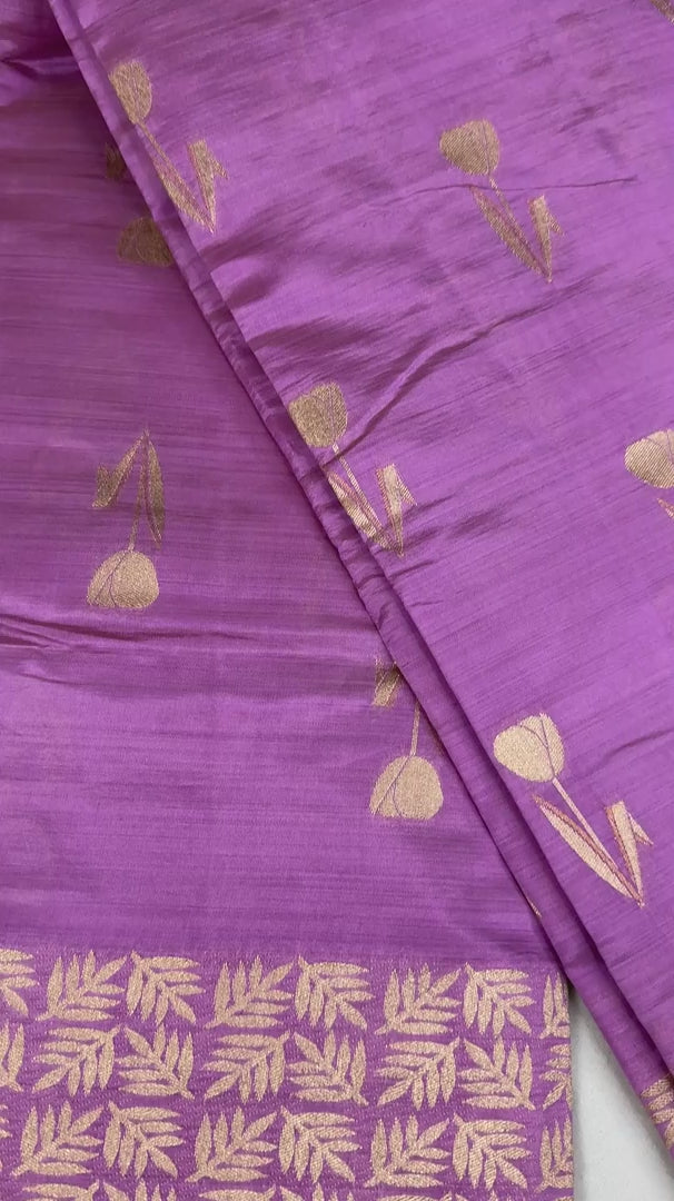 Adorn yourself with the subtle sheen and rich texture of this onion lavender Tussar saree. It features an intricate gold border with a traditional design, making this a timeless classic perfect for both special occasions and sophisticated everyday wear.