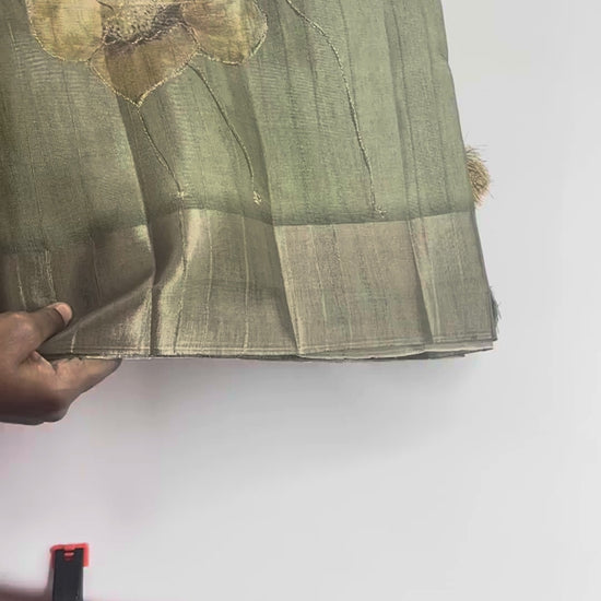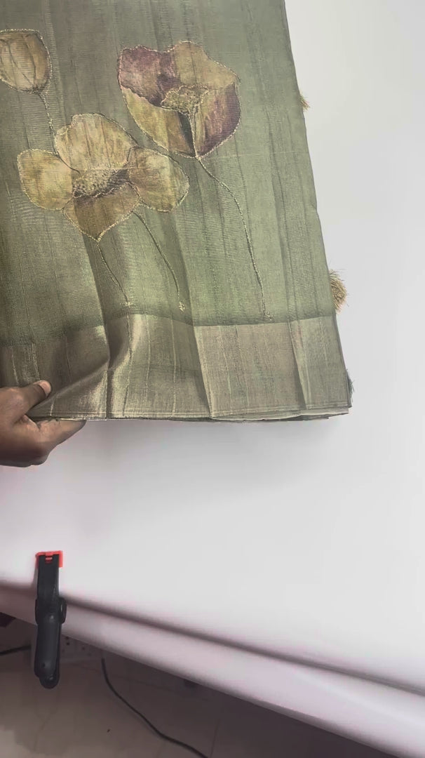 Tissue Silk Saree with Digital Floral and Ari Work (Dark Olive Green) | K3-004