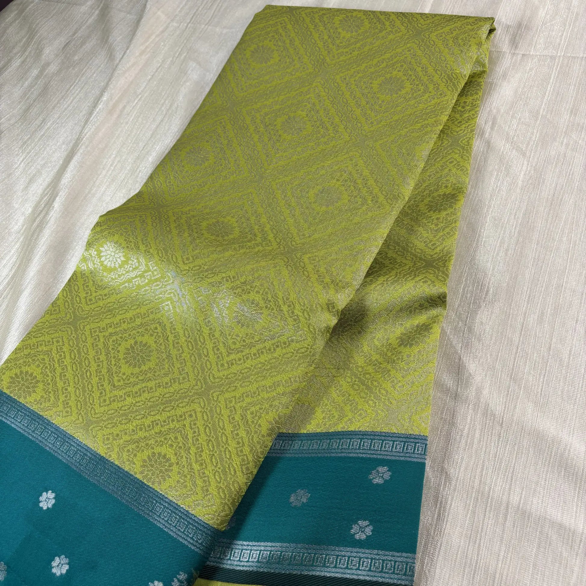 Drape yourself in timeless grandeur with this handwoven Tassar Jutt saree, drenched in a radiant parrot green body and paired with a teal blue pallu woven in intricate silver buttas. The shimmering geometric weave across the body echoes regal heritage, while the rich pallu lends an opulent finish that gracefully captures the light.